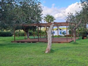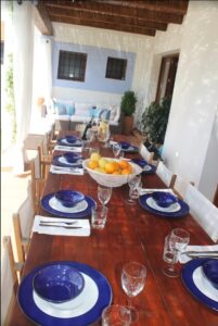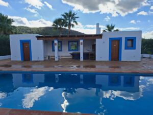 El exterior es un auténtico paraíso mediterráneo totalmente vallado, con un jardín maduro que incluye limoneros, perales, algarrobos, olivos, naranjos, aguacates y palmeras. La zona de ocio cuenta con una gran piscina, barbacoa, baños específicos para el área de baño y ducha externa.